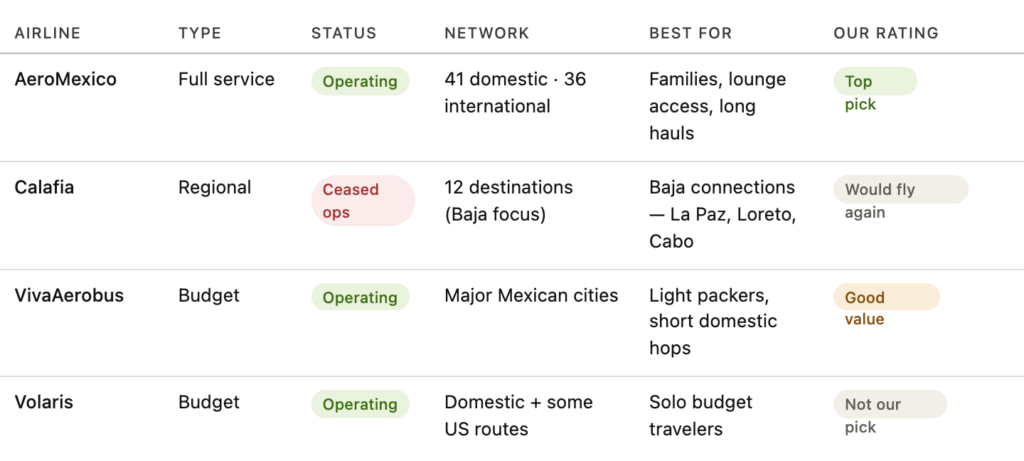 The Edit: This post reviews four Mexican airlines — AeroMexico, VivaAerobus, Volaris, and the now-defunct Calafia Airlines — based on firsthand flights taken by a family of four with an FAA-certified pilot. AeroMexico is the top pick for families due to its full-service experience, SkyTeam lounge access, and a network of 41 domestic and 36 international routes. VivaAerobus is a reliable budget option for short domestic hops, but baggage fees should be purchased online to avoid paying double at the counter. Volaris is the cheapest on paper but becomes comparable in price to AeroMexico once bags are added, making it a poor value for families. Calafia Airlines served niche Baja California routes before ceasing operations in late 2023.