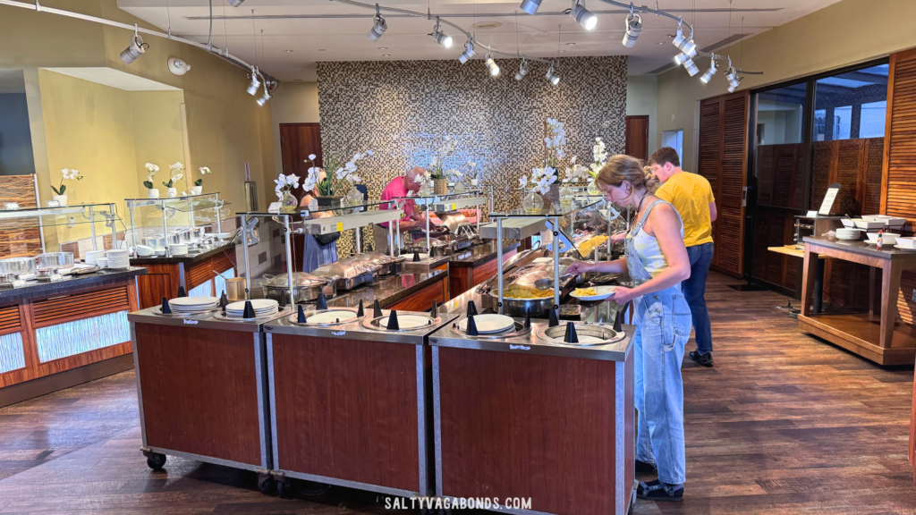 If you’re looking for an easy breakfast option right at the Hale Koa, Koko at Kalia is a solid choice. They do a full breakfast buffet with made to order omelets, pastries, fresh fruit, and all the basics you’d want before a beach day.