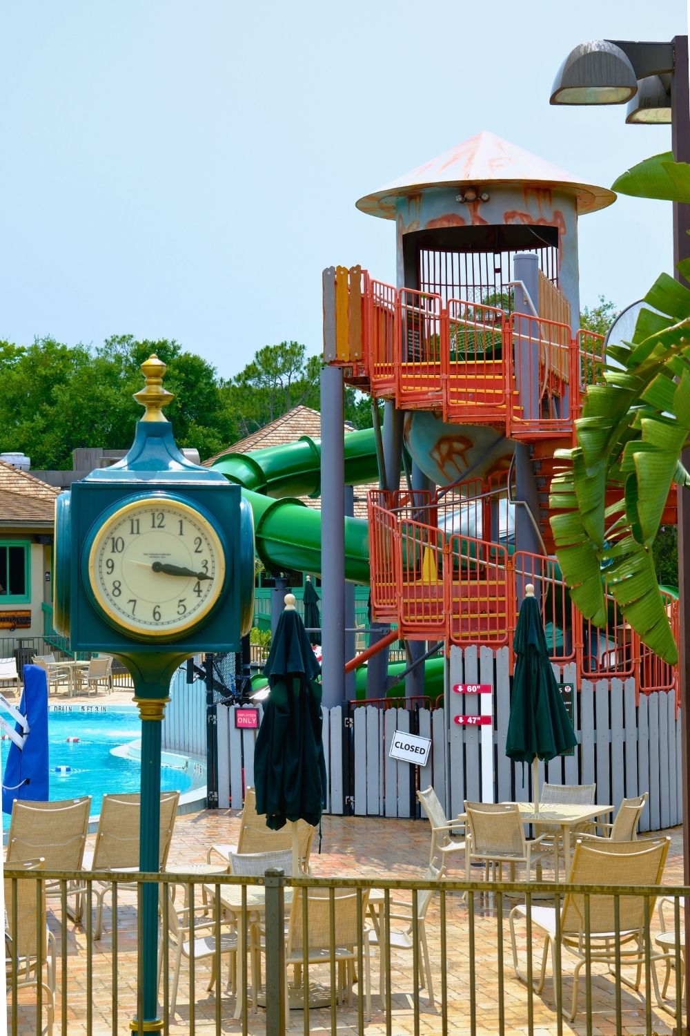This pool has everything you could want on vacation. There’s a splash pad for the smaller kids, a large water slide, a basketball hoop, and a deep pool to enjoy. Both pools have a life jacket station for those who aren’t strong swimmers.