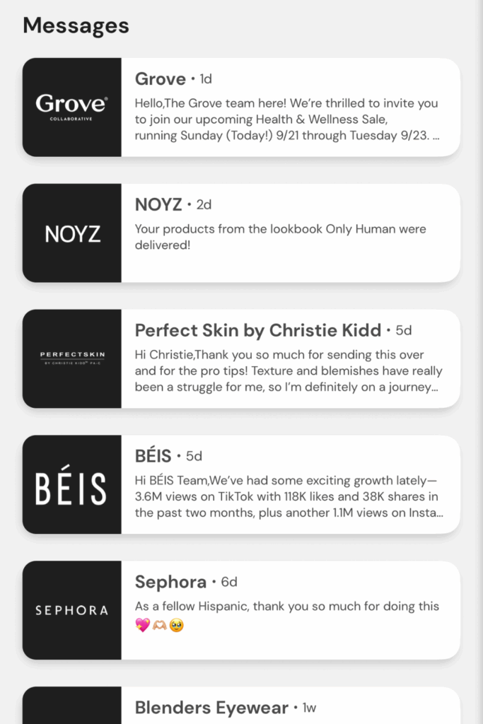Inside the Gifting tab, you’ll see when a brand wants to send you products. Each invite includes a message from the brand explaining who they are and why they’re gifting. Most brands are running seasonal campaigns, and many will attach a lookbook so you can browse their products.